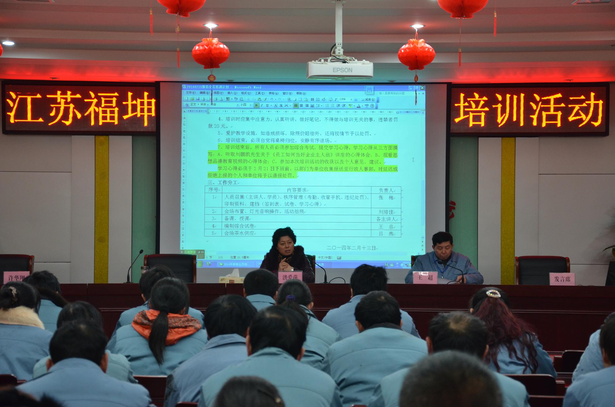 為提升員工綜合素質,全力打造一支精干 高質量的員工隊伍,加速企業健康快速發展,新春伊始,公司即組織全體員工脫產參加為期6天的培訓活動。課程涉及思想教育、規章制度、工藝紀律、質量標準、安 全規程、現場管理、法律法規等諸多內容。公司除精心組織內部師資力量外,還特別邀請了黑松林企業劉總、市質監局領導、上海行動成功培訓公司老師來司講座授課。豐富培訓內容和生動新穎的培訓形式激發了員工的學習熱情,幫助大家提升了業務知識水平?;顒尤〉脠A 滿成功,達到了預期目的和效果。