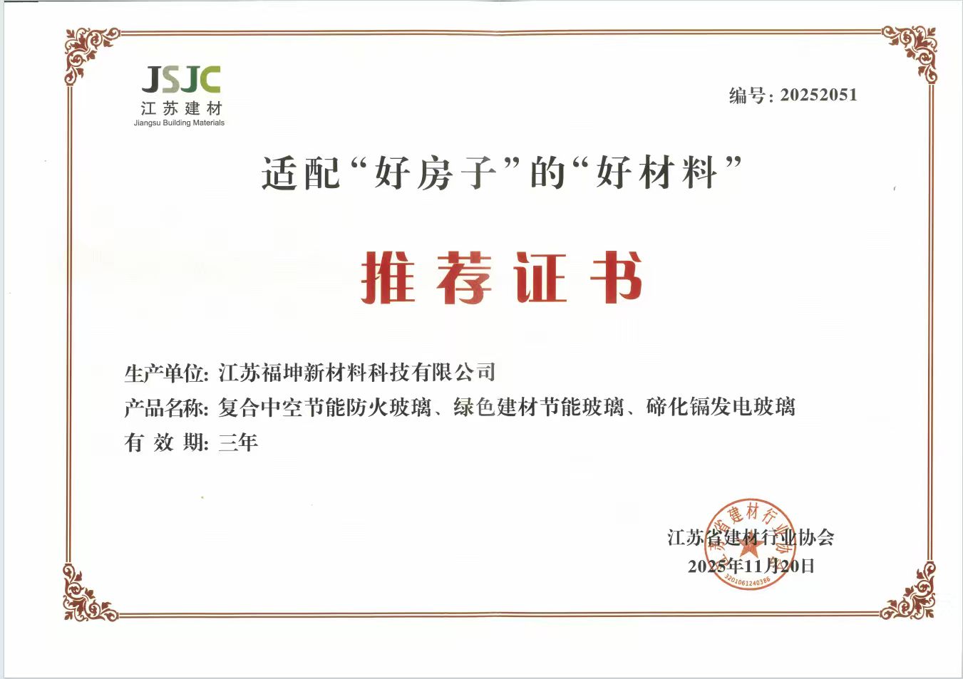 近日,我司的復合中空節能防火玻璃、綠色建材節能玻璃、碲化鎘發電玻璃三款產品,成功入選江蘇省建材行業協會“適配‘好房子’的‘好材料’”推薦名單,并獲頒推薦證書(編號:20252051),有效期三年。 此次入選的三款產品,精準契合“好房子”建設對綠色、節能、功能性建材的需求:復合中空節能防火玻璃兼顧隔熱節能與防火安全,綠色建材節能玻璃聚焦低碳減排,碲化鎘發電玻璃則融合建材屬性與光伏發電功能,為建筑賦能新能源應用。 江蘇省建材行業協會相關負責人表示,本次推薦旨在篩選適配高品質住宅的優質建材,助力“好房子”標準落地。我司憑借技術創新與產品性能,成為本次獲推薦的企業之一。