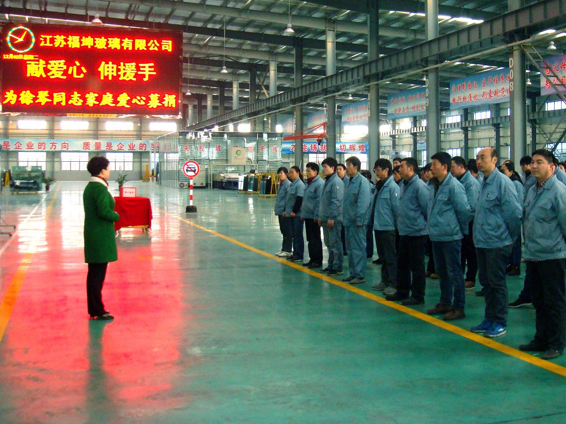 原鋼化車間員工徐琴同志不幸因病去世,公司利用晨會時間組織全體員工為其家庭募集善款5000元。此前在徐琴同志醫 療間,公司已捐助1.5萬元